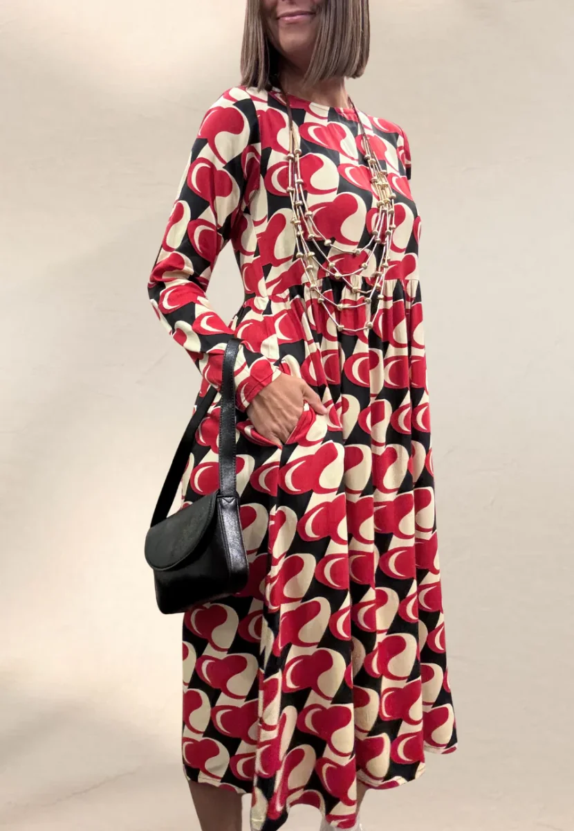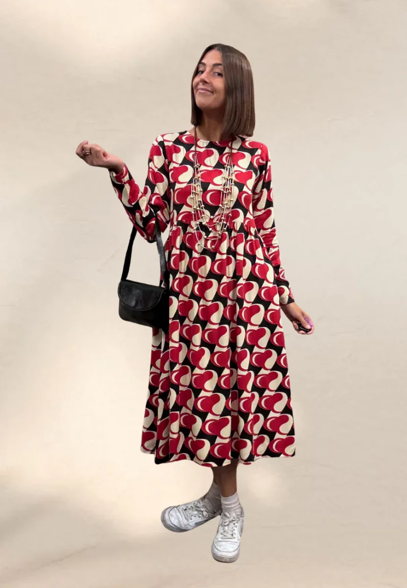 Abito midi, svasato con taglio sotto il seno, vestibilità molto morbida, bottoncino sul retro del collo.