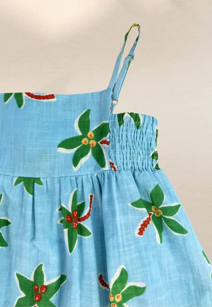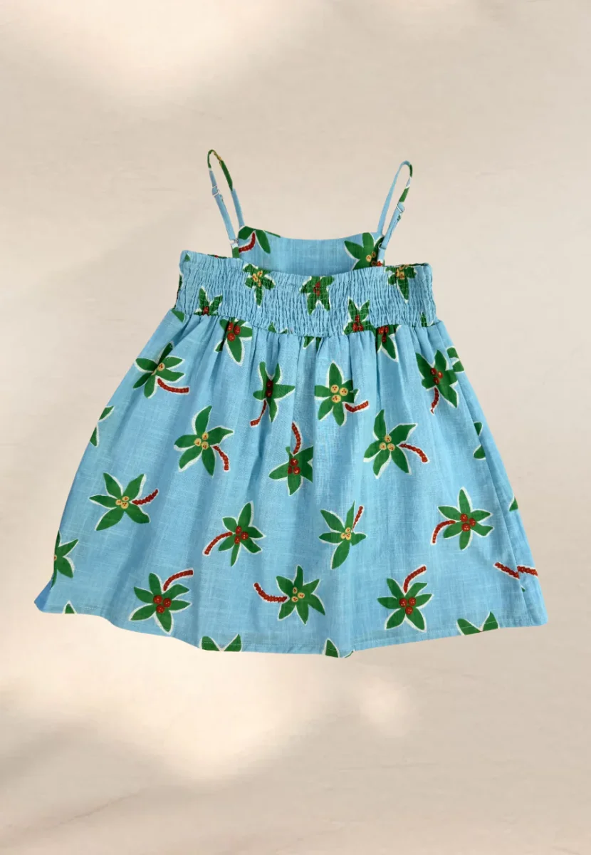 Abito corto per bambina con stampa palme. Scollo quadrato e senza maniche.