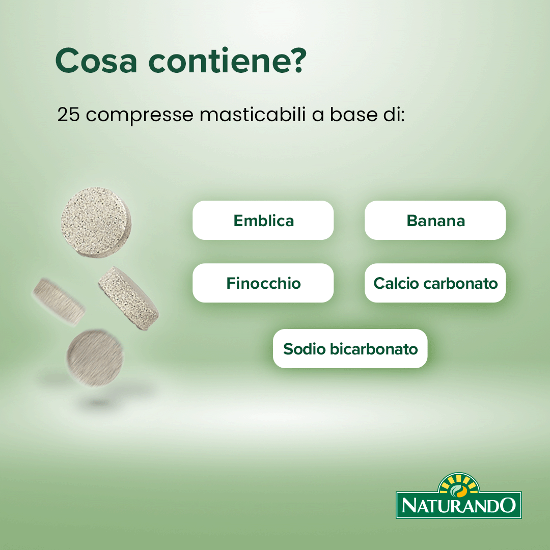 Integratore alimentare a base di Emblica, Banana, Finocchio con Calcio Carbonato e Sodio Bicarbonato