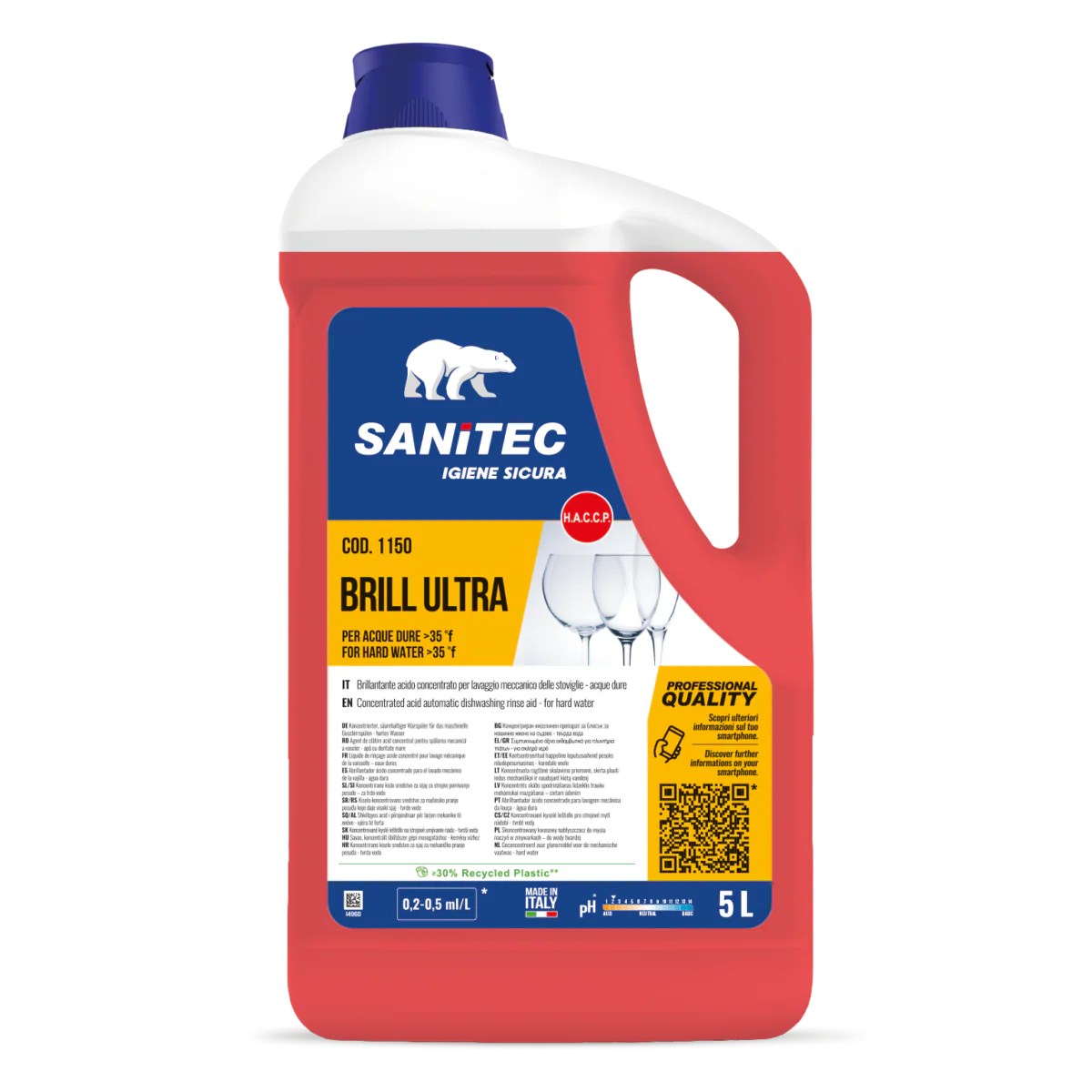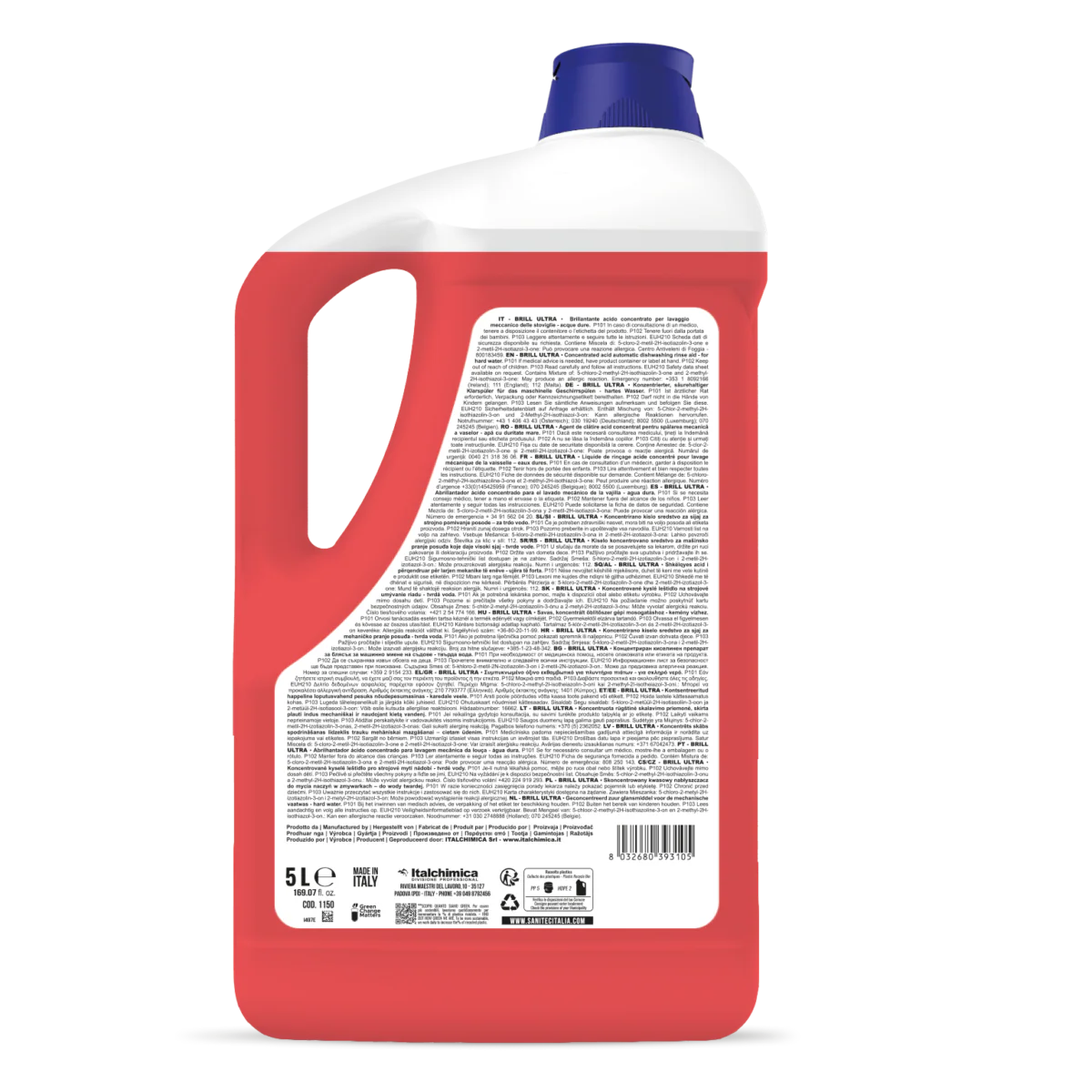 BRILL ULTRA 5LT è un detergente innovativo che accelera l’asciugatura delle stoviglie, garantendo risultati impeccabili anche su superfici in plastica. La sua formula a schiuma controllata assicura stoviglie brillanti, prive di aloni e macchie d’acqua. Grazie all’azione neutralizzante, protegge il vetro dai residui caustici, preservandone la trasparenza nel tempo. Inoltre, favorisce l’eliminazione dei cattivi odori, lasciando un ambiente fresco e pulito. Una soluzione completa per una pulizia raffinata e senza compromessi.