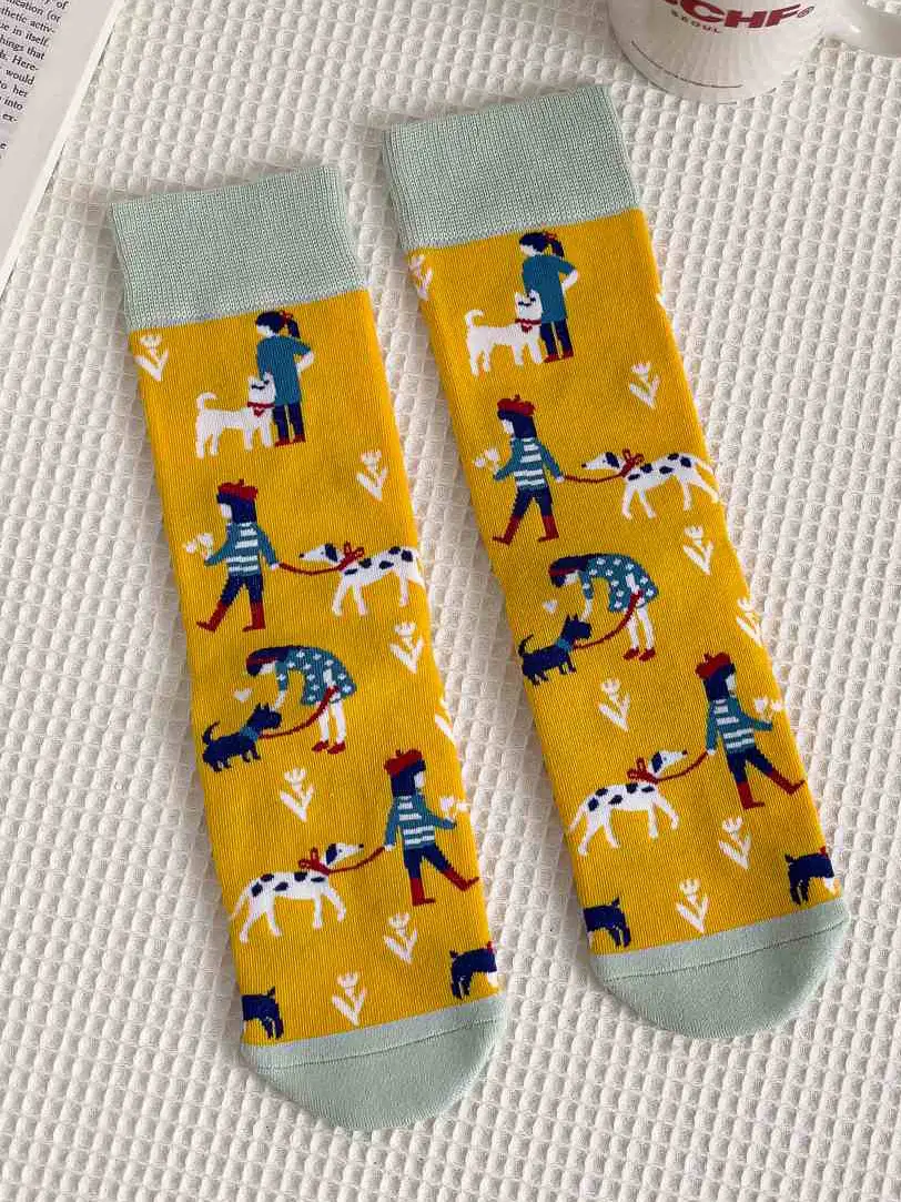 Calzini con illustrazioni di persone che passeggiano con i loro cani, pieni di dettagli caldi e quotidiani. Un design allegro che trasmette amore per gli animali domestici e i piccoli momenti della vita quotidiana.