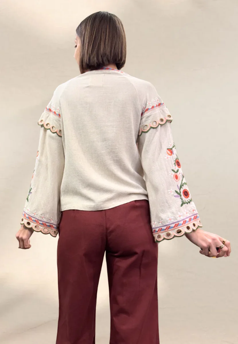 Questa blusa dal taglio molto morbido è impreziosita da dettagli ricamati su maniche e corpetto.