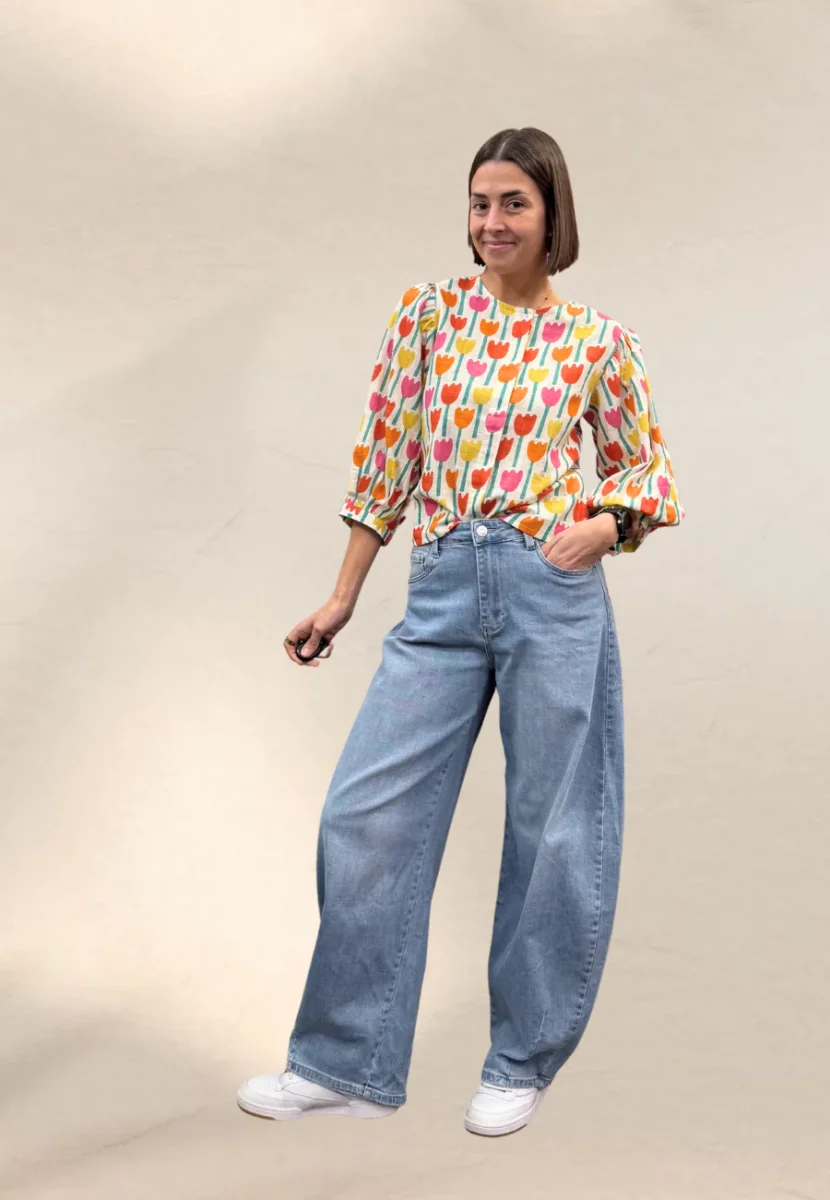 Camicia dal taglio dritto con maniche a palloncino a 3/4 e scollo tondo.