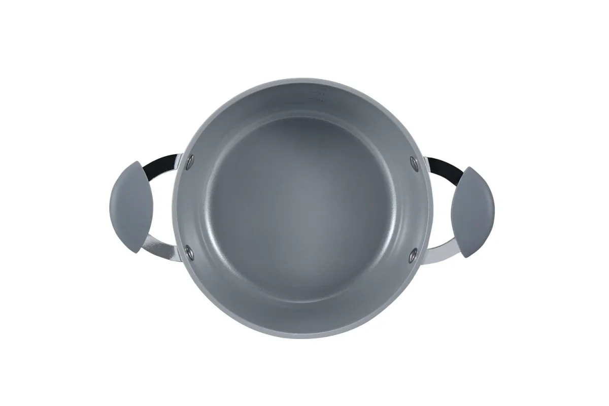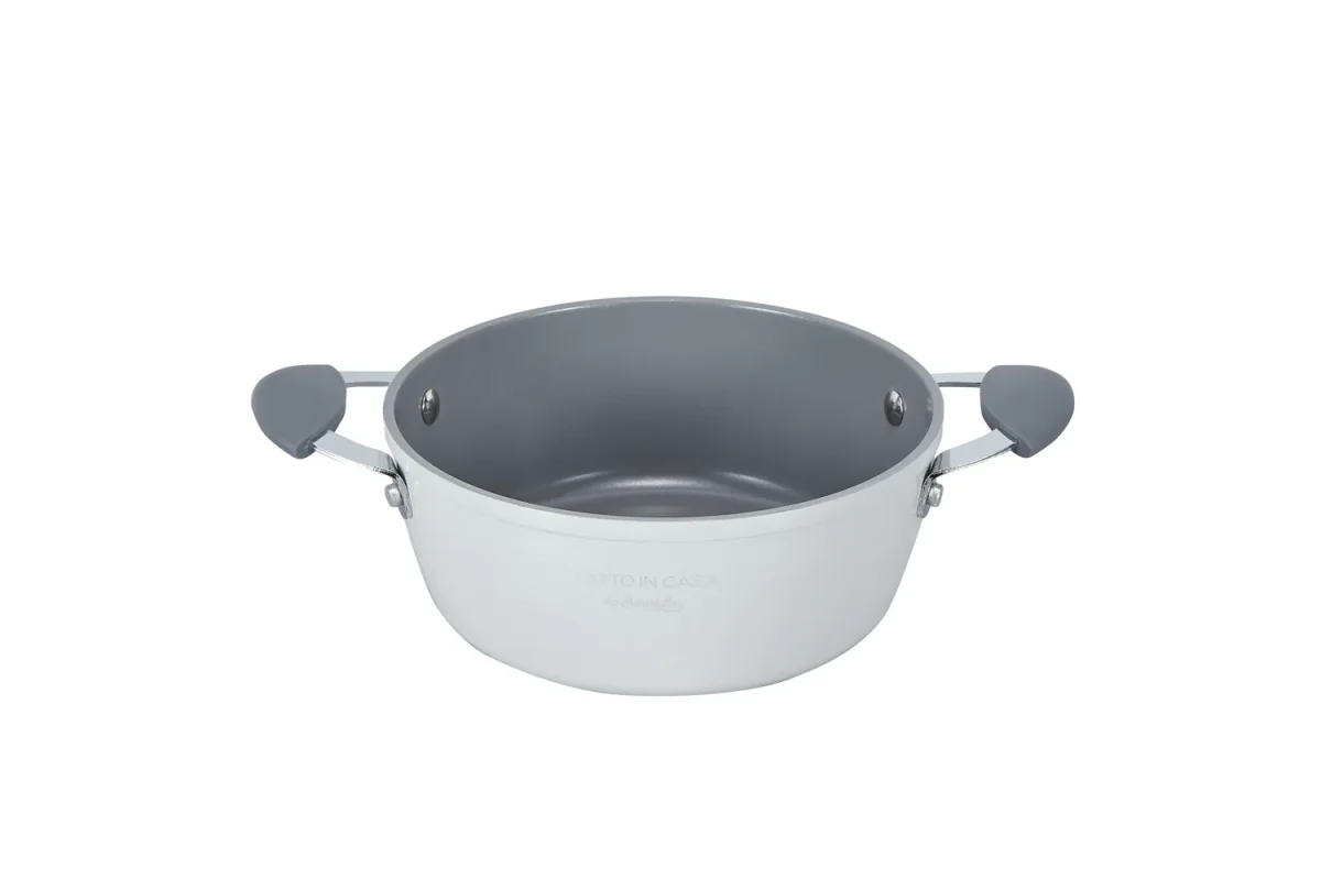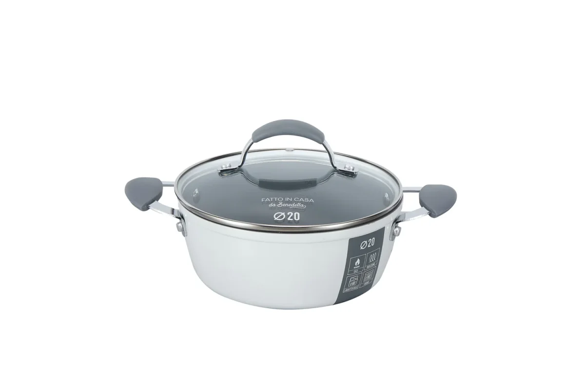 Casseruola da 20 cm di diametro in alluminio forgiato 100% riciclabile, dotata di rivestimento ceramico antiaderente a base d’acqua, nickel free e privo di PFAS e metalli pesanti. Ha un fondo a induzione “edge to edge” (da bordo a bordo) che copre tutta la superficie del fondo, in acciaio inox 430 nickel free, che le consente di trattenere il calore in modo più efficiente e di utilizzare quindi una fonte di calore a medio-bassa durante la cottura.
