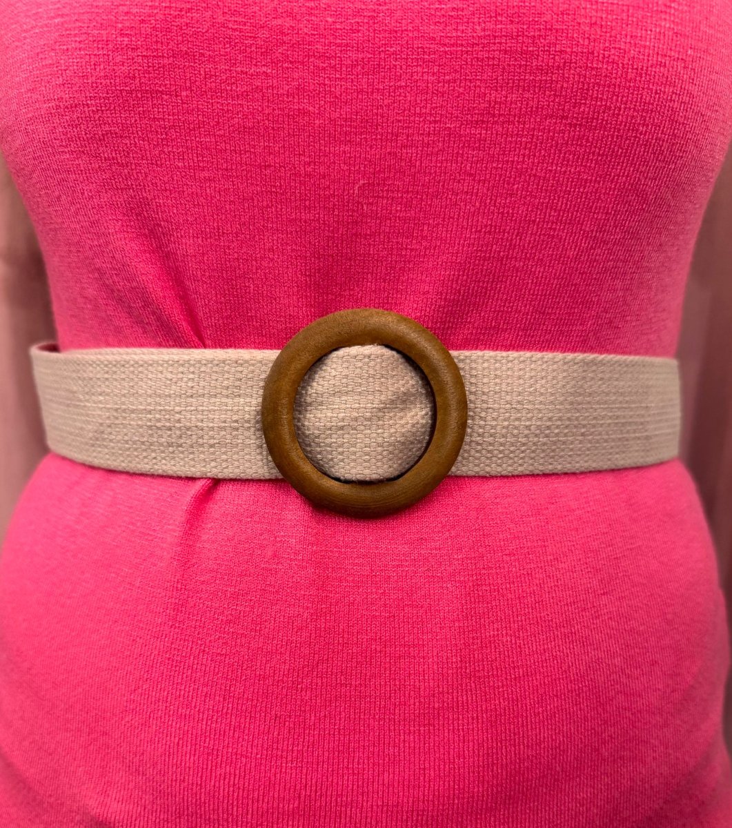 Cintura in corda non elasticizzata con anello di chiusura di diametro 5,5 cm, altezza 4 cm lunghezza 100 cm.