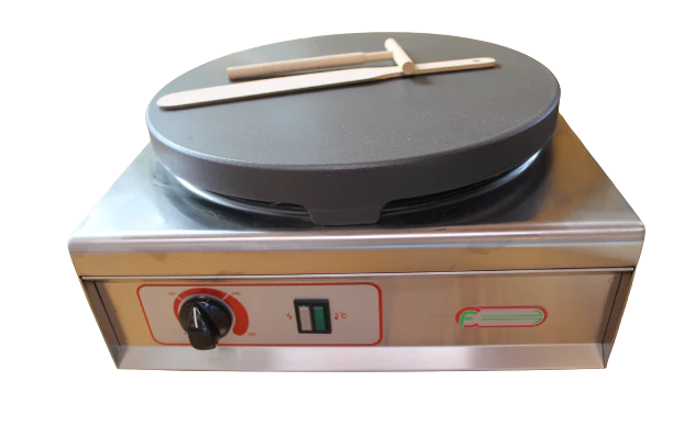 Crepiera elettrica professionale con piano cottura in ghisa smaltata antiaderente e antigraffio.