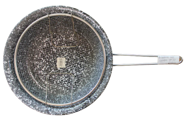 Antigraffio, la friggitrice smaltata è dotata di una forma conica, la quale permette un risparmio d’olio, un cestello in rete elettrosaldata con stagnatura a norma di legge per alimenti con anello monoscocca e un manico pieghevole salvaspazio.