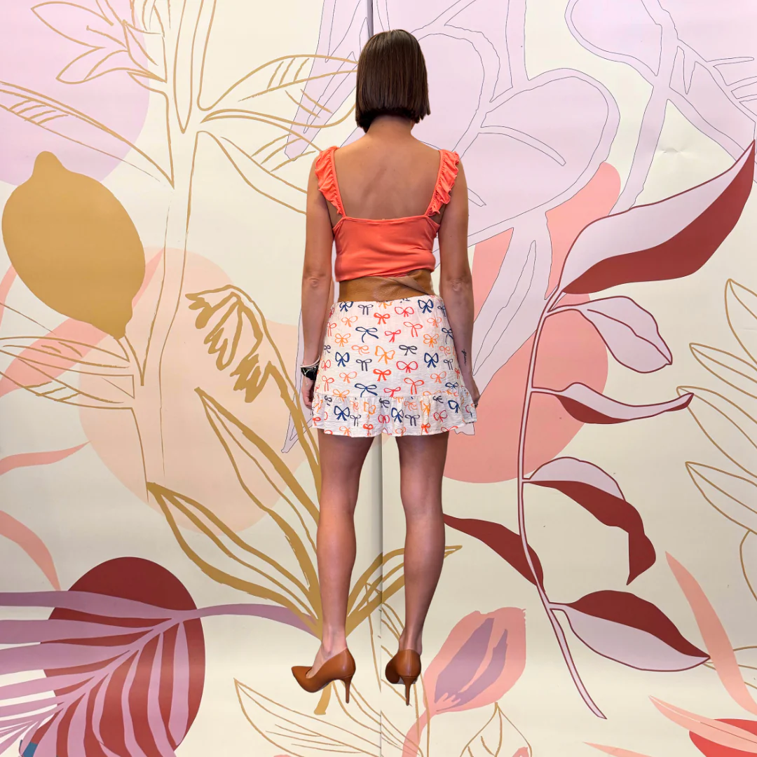 Gonna corta in crêpe leggero con stampa a fiocco. Con elastico in vita a vita media. Dettaglio volant sul fondo e nido d’ape in vita.