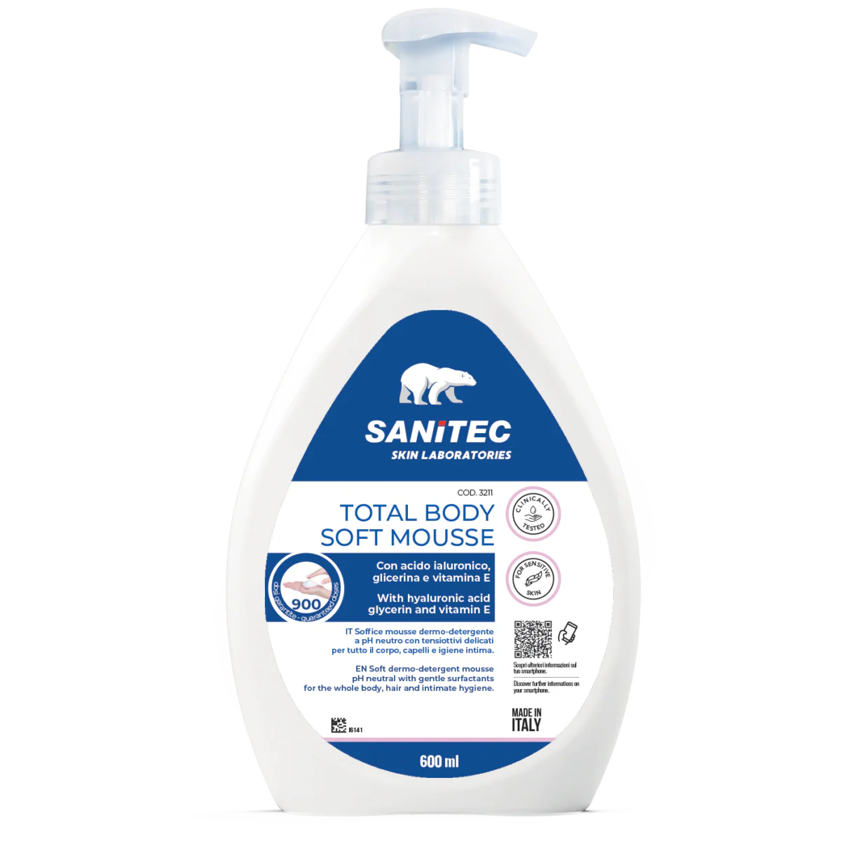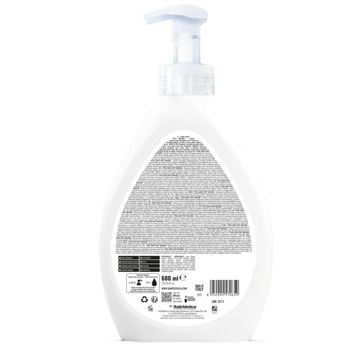 TOTAL BODY SOFT MOUSSE TE’ VERDE 600ML combina acido ialuronico, glicerina e vitamina E per una detersione delicata e profonda. Adatto a tutti i tipi di pelle, questo mousse garantisce un’igiene quotidiana completa, ideale anche per la detersione assistita, lasciando la pelle morbida, idratata e protetta.