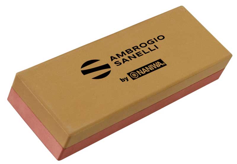 Pietra ed acqua (whetstone) combinata, grana 1000/3000. Il lato 1000 è ideale per la fase di sgrossatura e per la prima sistemazione del filo, mentre il lato 3000 è ideale per l’affilatura.