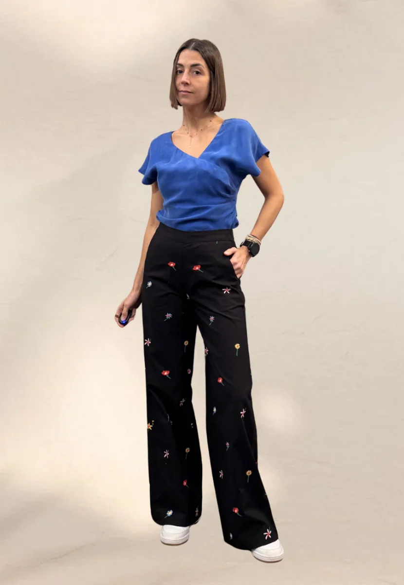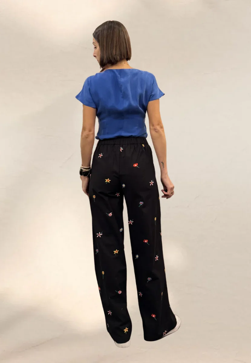 Pantalone a gamba dritta con elastico in vita nella parte posteriore.