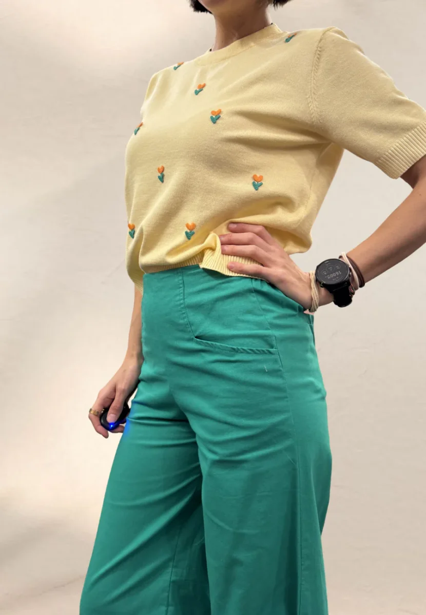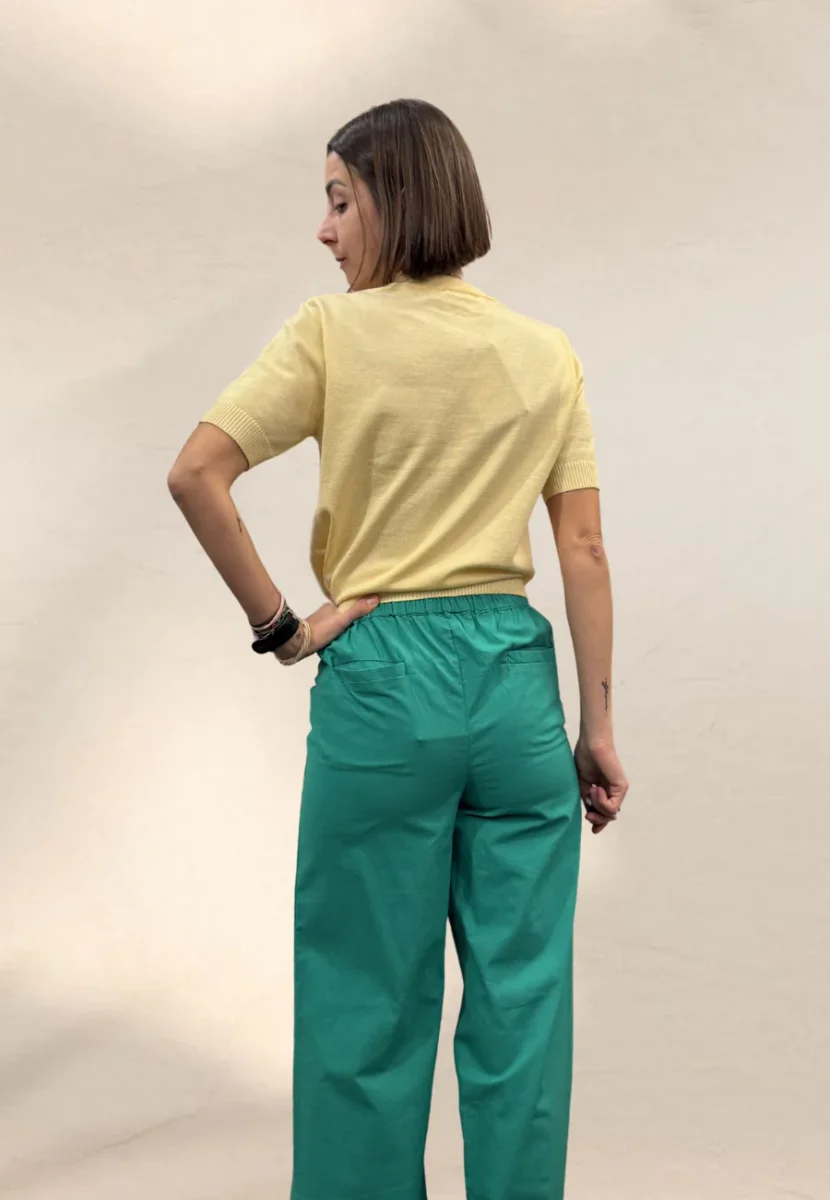 Pantalone con elastico in vita nella parte posteriore, gamba dritta e morbida.