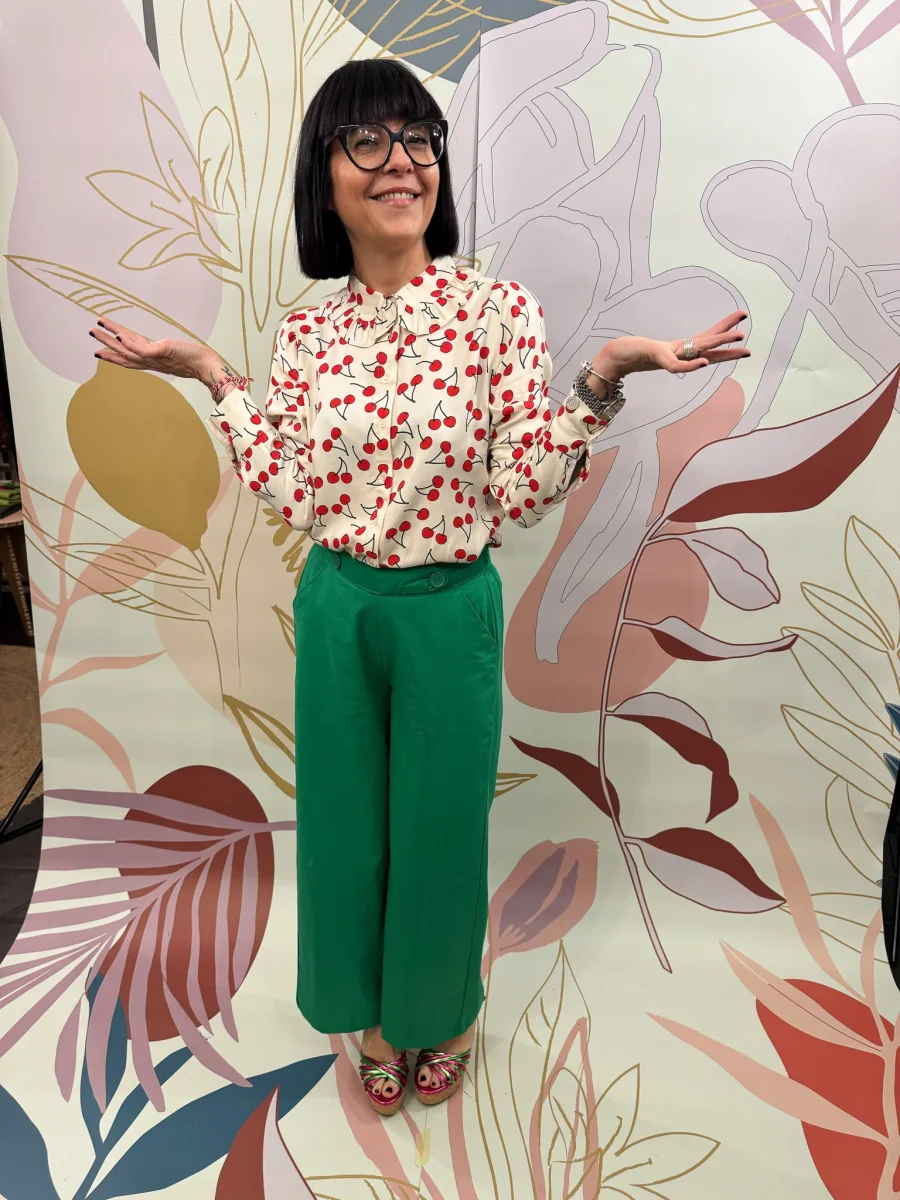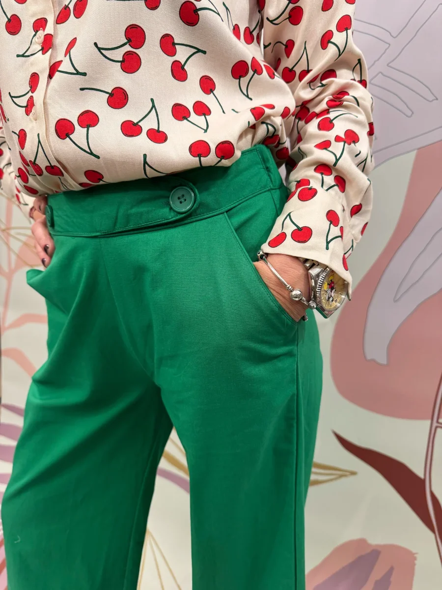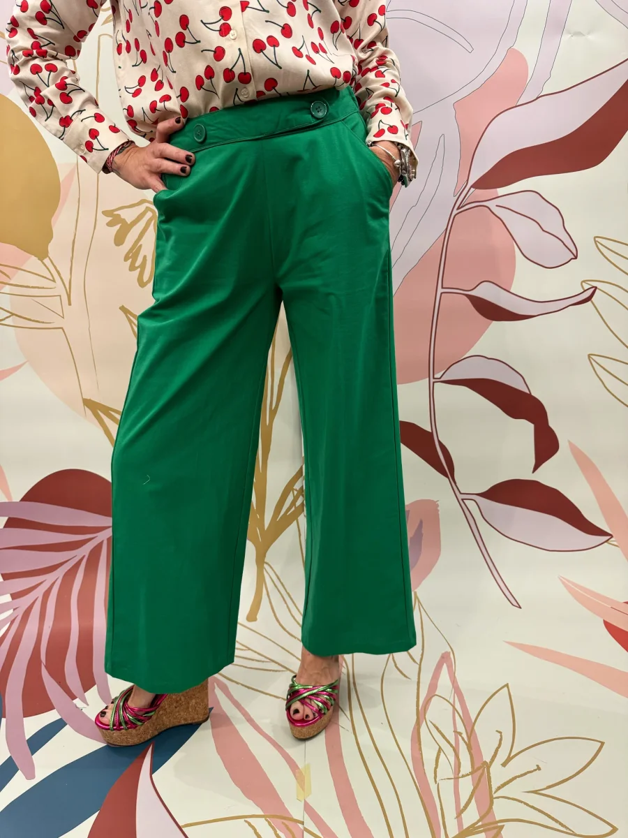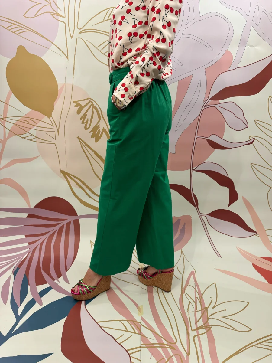 Pantalone con tasca america, elastico sul retro, gamba larga.