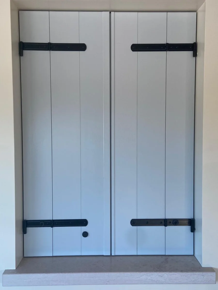 Scuro alla padovana con snodo, fissaggio cardini a murare, spalla iniziale da 14,8 cm, poi snodo esterno. Completo di fermascuri a calamita ed accessori di serie.