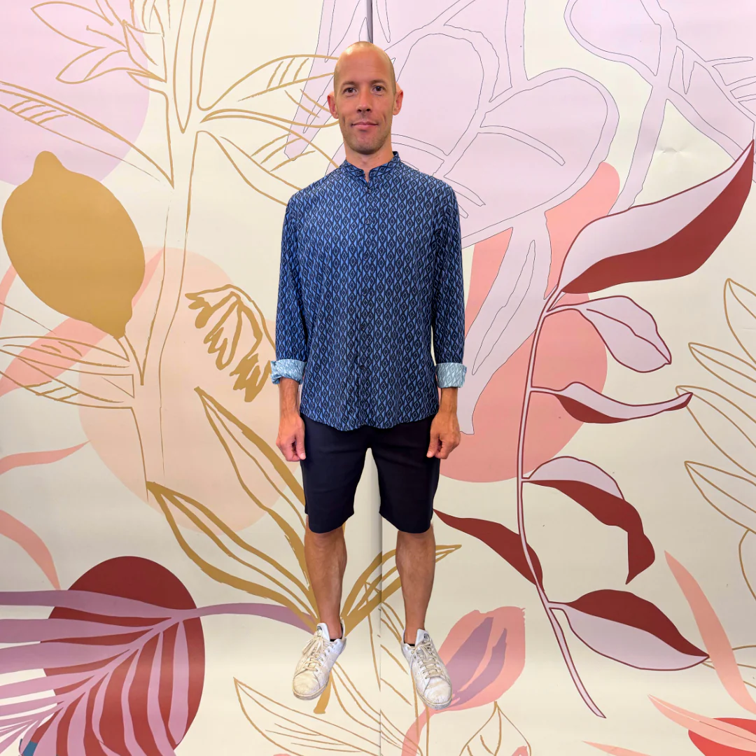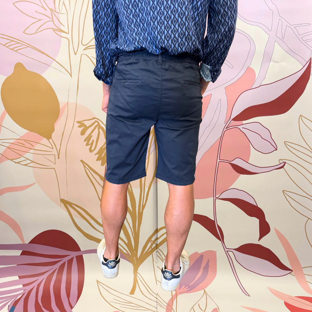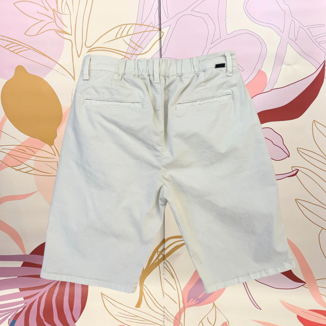 Short ‘tapered fit’ , chiusura bottone più zip con elastico in vita parte dietro tasca a filo. 97% cotone 3% elastene