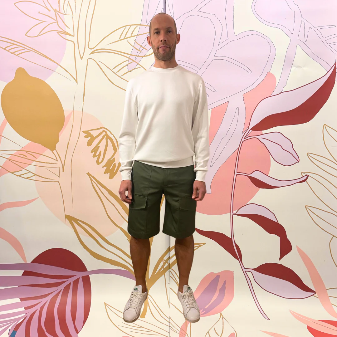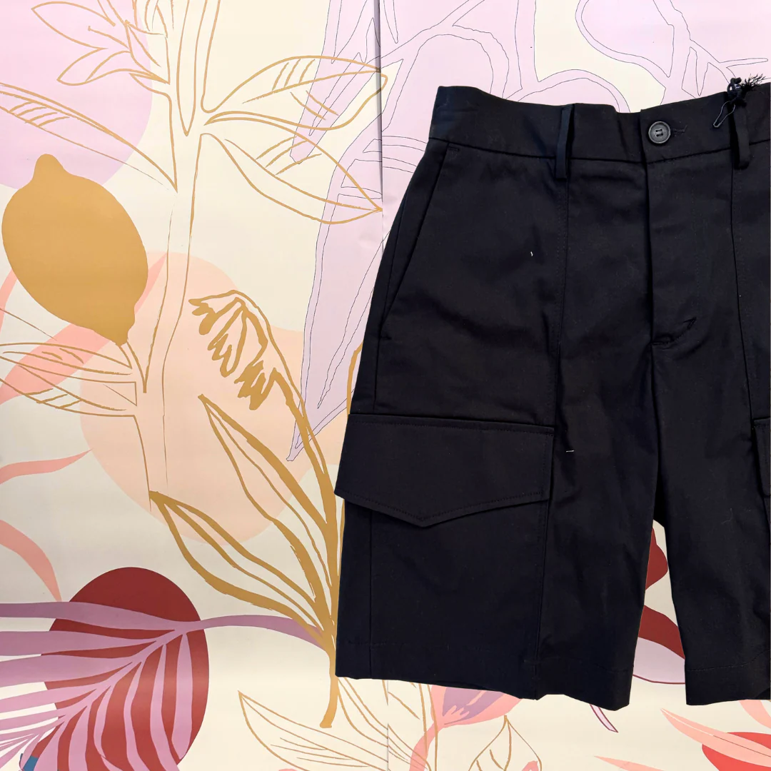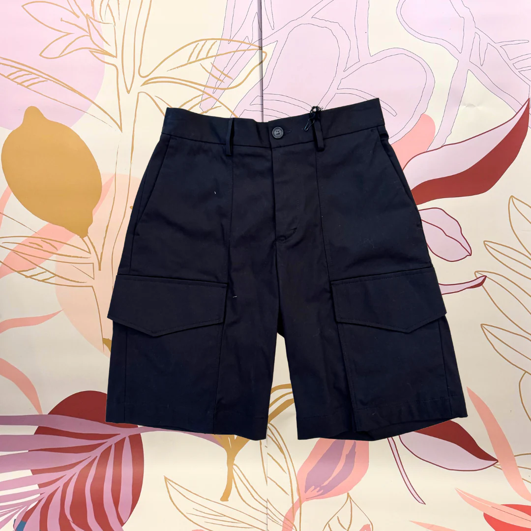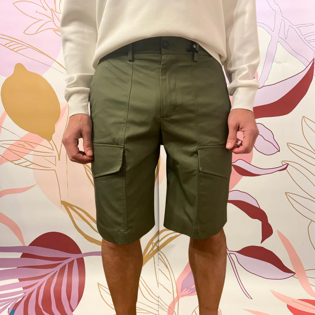 Short cargo con tascone laterale ‘ ANTI FIT’. Con elastico in vita, chiusura bottone più zip. 98% cotone 2% elastene