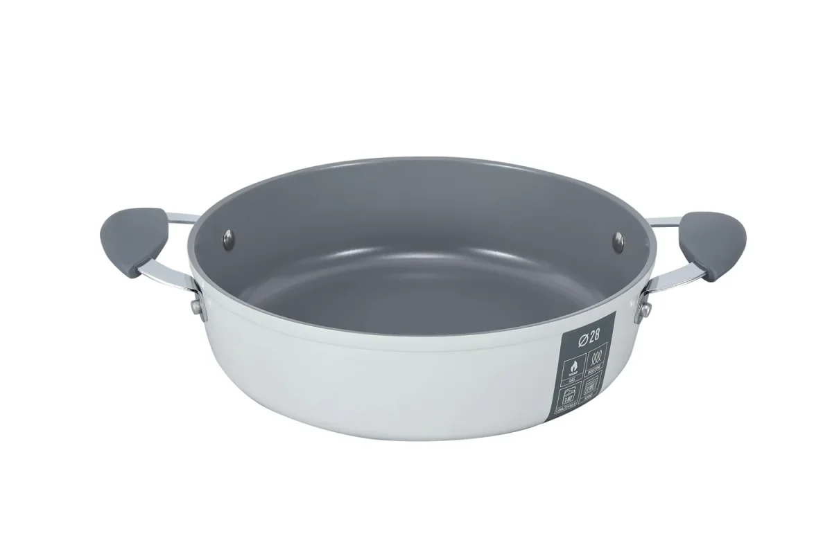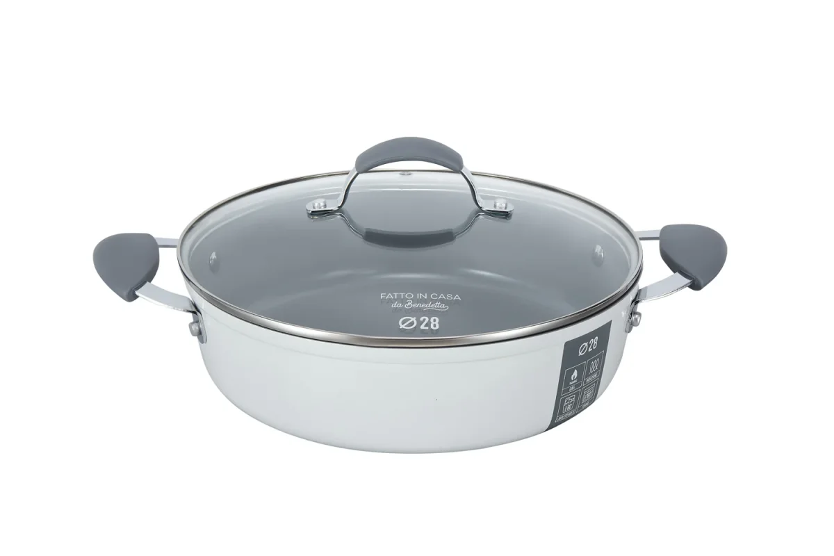 Casseruola bassa da 28 cm di diametro, in alluminio forgiato 100% riciclabile e con rivestimento ceramico antiaderente a base d’acqua, nickel free e privo di PFAS e metalli pesanti. Polivalente e versatile, questa casseruola è adatta a vari tipi di cotture, in particolare preparazioni che non richiedono bollitura, come arrosti, brasati e stufati di carne. Dotata di fondo a induzione “edge to edge” (da bordo a bordo) che copre tutta la superficie del fondo, in acciaio inox 430 nickel free. Trattiene il calore in modo più efficiente e consente di ridurre la fonte di calore a medio-bassa durante la cottura. I manici in silicone e metallo sono idonei al forno e rivettati per una garanzia di stabilità e solidità. La casseruola è abbinata a un coperchio in vetro temperato con sfiato vapore, pomolo rivettato e impugnatura in silicone per una presa salda e sicura. È idonea all’utilizzo in forno ed è lavabile in lavastoviglie.