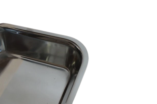 Teglia rettangolare in acciaio inox di prima qualità con angoli arrotondati.