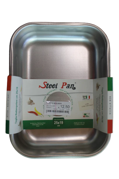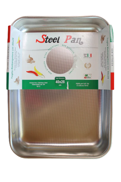 Teglia lasagnera rostiera da forno in acciaio inox con particolare fondo zigrinato ad effetto antiaderente e maniglie laterali pieghevoli.