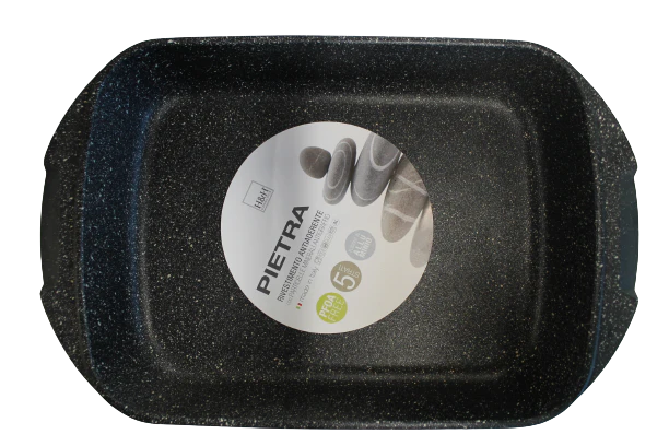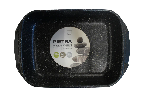 La rosticcera antiaderente pietra è realizzata in alluminio pressofuso, rivestimento antiaderente 5 strati con particelle in pietra antigraffio che permettono di cucinare senza l’aggiunta di grassi, a vantaggio di una cucina più salutare.
