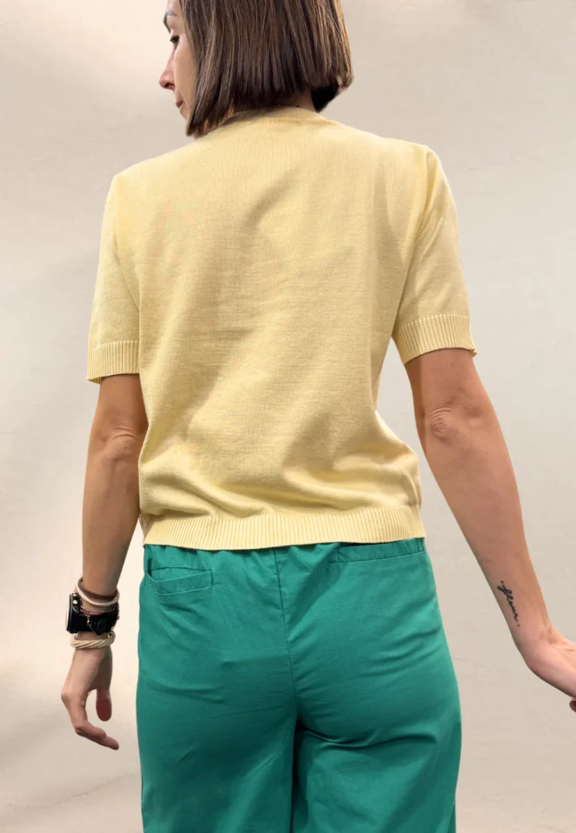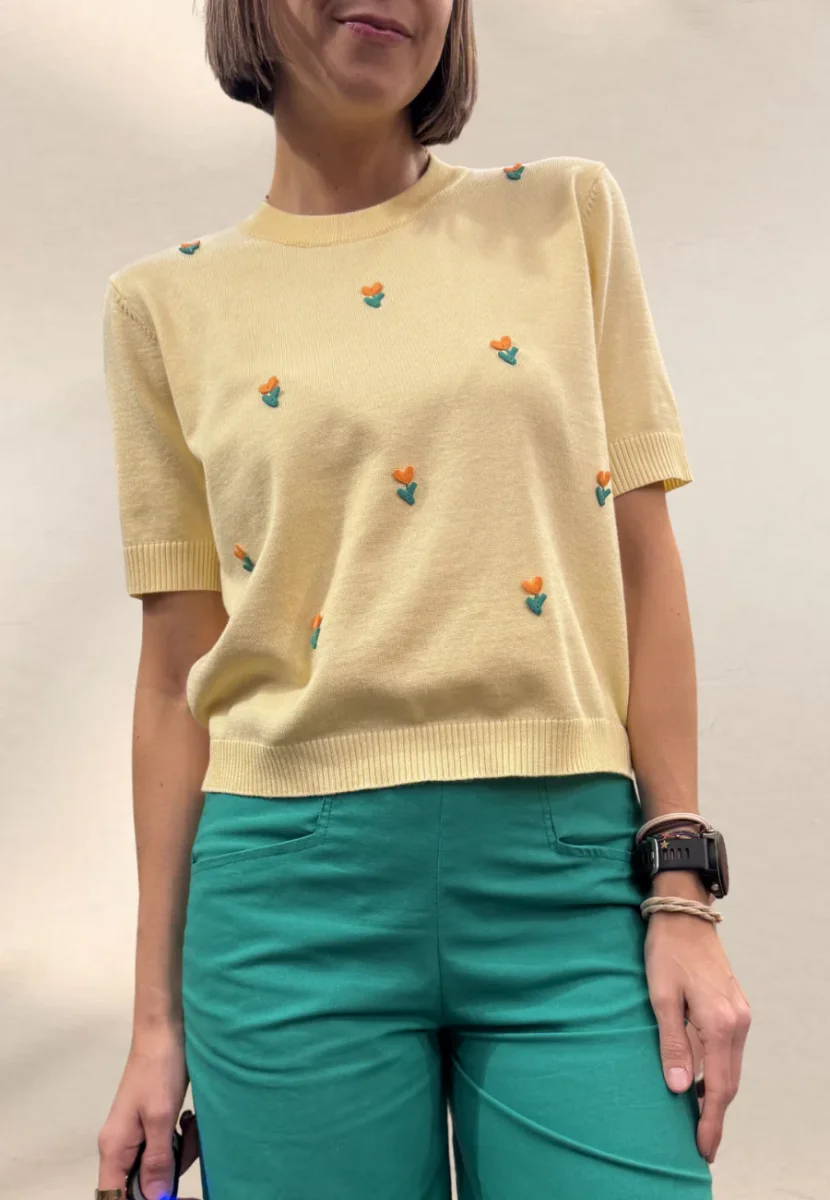 Top a maniche corte in maglina con ricami, dal taglio morbido.