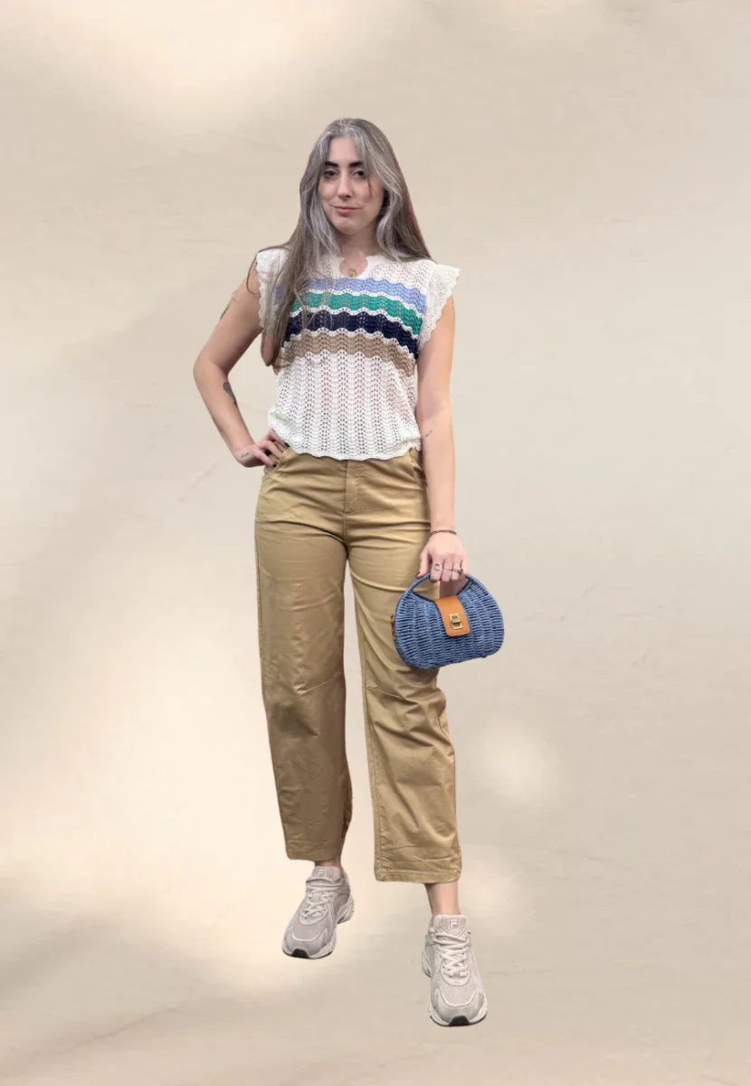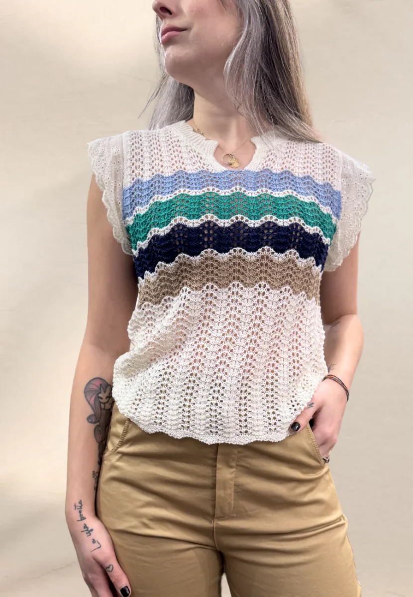 Top crochet, traforato, con rouches sulla spalla.