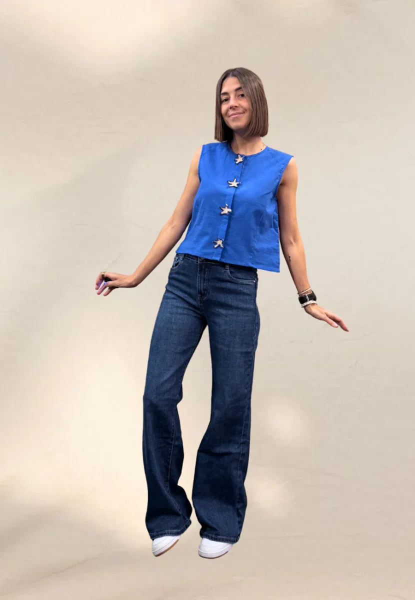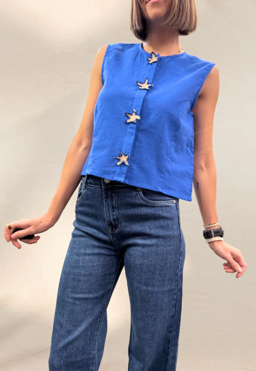 Top smanicato, con bottoni a stella cuciti, vestibilità regolare.