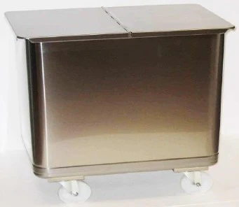 Tramoggia carellata in AISI 304, con angoli raggiati e 4 ruote piroettanti diametro mm 100