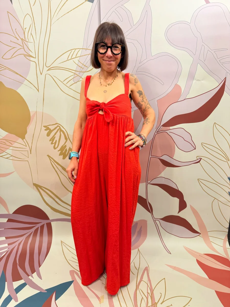 Tuta lunga e fluida, con fiocco ed elastico sul retro e apertura sul petto. Ha delle tasche. 72%RAYON 28%CHINLONL