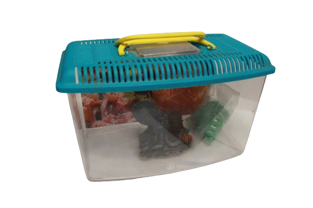 Trasportino per pesci in plastica con coperchio.