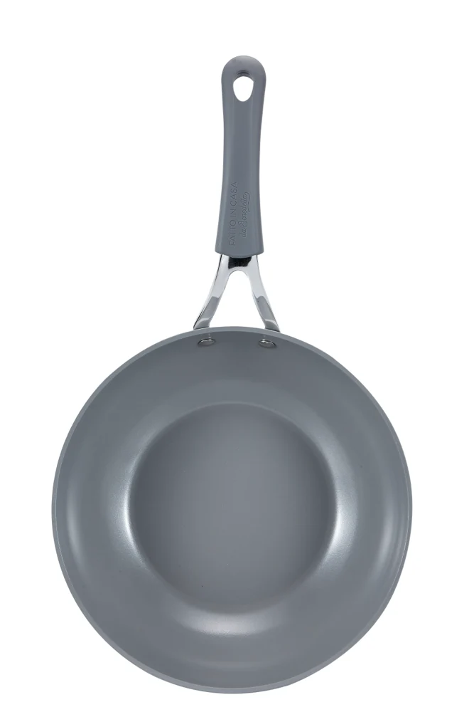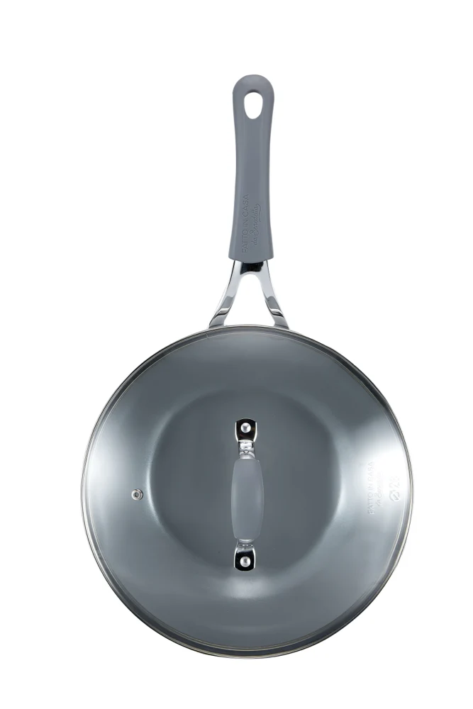 Wok da 28 cm di diametro in alluminio forgiato 100% riciclabile e fondo con spessore di 3,8 mm. Ha un innovativo rivestimento ceramico a base d’acqua antiaderente, privo di PFAS e di metalli pesanti e nickel free. Il fondo a induzione, detto “edge to edge” (da bordo a bordo) copre tutta la superficie del fondo ed è in acciaio inox 430 nickel free. Trattiene il calore in modo più efficiente e consente di ridurre la fonte di calore a medio-bassa durante la cottura. Il manico in silicone e metallo è idoneo al forno e rivettato per una garanzia di stabilità e solidità, ed è dotato di asola che consente di appendere la padella. L’indicazione del diametro sull’esterno permette un facile accoppiamento con i coperchi e un abbinamento intuitivo con le quantità di ogni ricetta. È abbinato a un coperchio in vetro temperato con sfiato vapore, pomolo rivettato e impugnatura in silicone per una presa salda. Adatto a cotture a gas, induzione e tutti gli altri tipi di piani cottura.